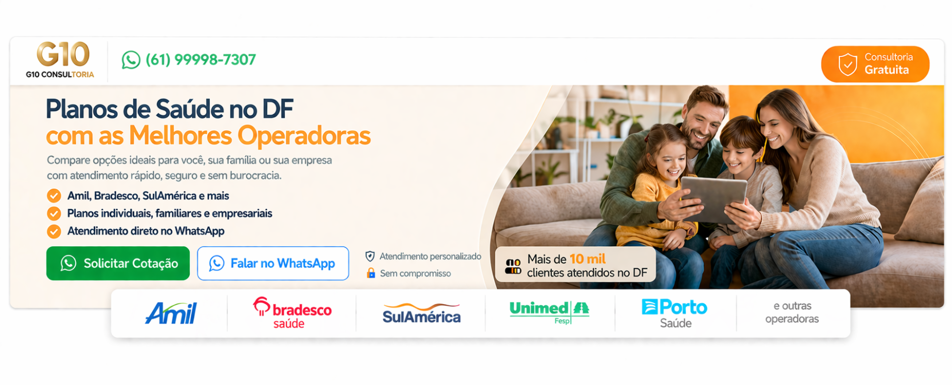 Encontre os melhores Planos de Saúde DF com agilidade, economia e atendimento humanizado. A G10 Med Consultores oferece soluções completas em planos de saúde em Brasília DF, com acesso às principais operadoras do mercado e condições exclusivas para você e sua família.